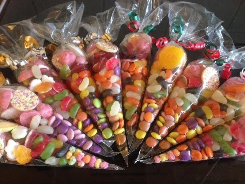 Our Sweetie Cones are the perfect alternative to party bags or a great addition to buffets and party food. The bags are filled to the top with a selection of favourites, rainbow drops / marshmallows at the bottom then layers and layers of soft jelly sweets and chews.