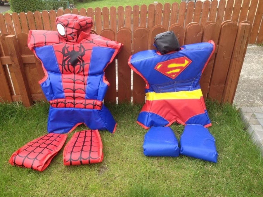 Our kids Superhero sumo suits in the form of Spiderman and Superman are unique and really popular with kids. These Superhero sumo suits come with the matching helmets, neck braces and gloves along with the 12ft padded sumo mat, all of which make for a safe enjoyable kids game. The suits are easily slipped on over the head for quick change overs.