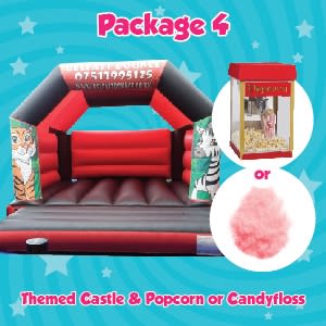 This bouncy castle package deal is perfect for any boys or girls party - you can choose from a wide range of velcro themes and have them put onto any of our base castles. Then select either our Sweet Popcorn machine or Sticky Candyfloss machine - both a huge hit at parties!